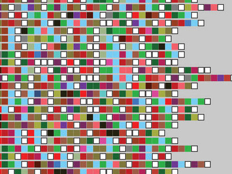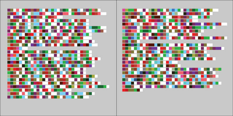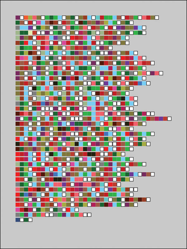 Using a simple Javascript routine and Illustrator I've been taking everyday text from emails, news headlines, and even works of literature and converting them into abstrated landscapes of colored blocks.