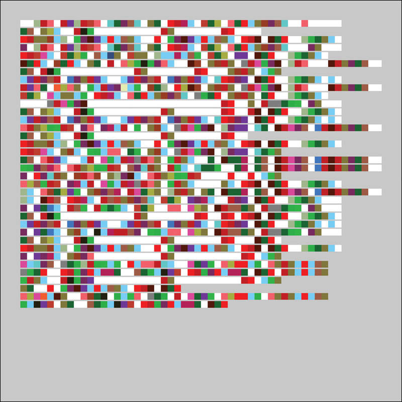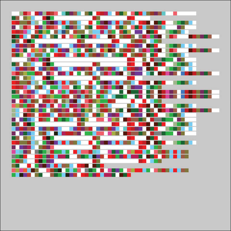 Using a simple Javascript routine and Illustrator I've been taking everyday text from emails, news headlines, and even works of literature and converting them into abstrated landscapes of colored blocks.